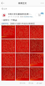 支部重视宣传阵地建设,努力发挥其统一思想、教育群众、推动工作的重要作用,认真落实“一会一稿,一活动一稿”,构建多维立体宣传体系。2021年支部共投新闻稿22篇,其中中南大学学工网3篇,院网19篇,彰显支部风采,不断提升传播力、引导力、影响力、公信力。支部党建动态受学院相关公众号推介6次,其中推文《点赞!交通院研究生第一党支部“三行情书献礼建党一百年”征稿活动!》阅读量近7000次,创其历史之最。同时支部设“中南大学交通院研究生第一党支部”官方微博,由宣传委员运营,不定期转发分享时政热点和理论知识,发布支部相关党建动态。支部于2021年6月获交通院2020-2021年新闻宣传工作先进集体二等奖。