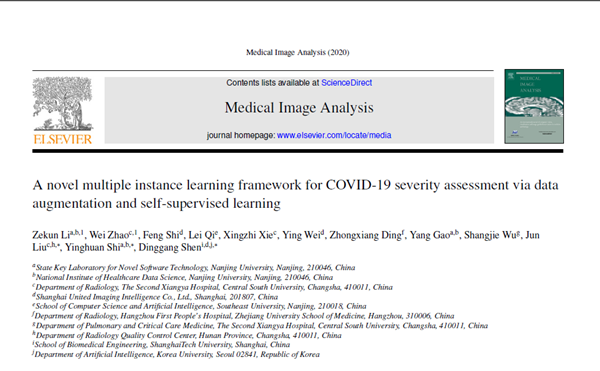 近日,我院放射科在医学图像处理顶级期刊《MEDICAL IMAGE ANALYSIS》(IF=11.48)发表题为“A novel multiple instance learning framework for COVID-19 severity assessment via data augmentation and self-supervised learning”的论文。放射科第一党支部书记、主任刘军为第一通讯作者,赵伟博士为共同第一作者。这是放射科2021年第一篇10分以上的文章,第二篇5分以上的文章,另一篇刊登于期刊《Pattern Recognition》。
