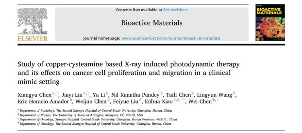 近日,中南大学湘雅二医院放射科肖恩华、陈翔宇课题组与美国德州大学陈伟教授的国际团队合作,在国际顶级生物材料学刊物《Bioactive material》(IF=14.59 ,Biomaterials领域排名第一)上发表了题为“Study of Copper-Cysteamine Based X-Ray Induced Photodynamic Therapy and Its Effects on Cancer Cell Proliferation and Migration in a Clinical Mimic Setting”的研究论文。中南大学湘雅二医院为该论文的第一作者单位,其中陈翔宇副主任医师和刘佳易博士为共同第一作者,肖恩华教授和陈伟教授为共同通讯作者。