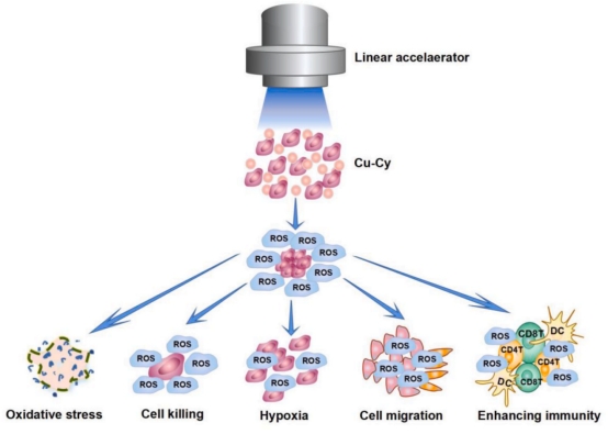 光动力治疗(PDT)是一种特殊的治疗方法,通过将无毒光敏剂(PS)与波长相近的光结合,产生具有细胞毒性的活性氧(ROS)引起癌细胞损伤,从而消除有害细胞或不健康组织。光敏剂通常在黑暗中无毒或毒性较低,当用适当波长的光照射时,光敏剂可将能量转移至附近的基态分子氧(3O2)以形成单线态氧(1O2)而杀死癌细胞。然而由于光的穿透能力差,组织穿透深度仅为几毫米,因此传统的光敏剂,大多应用于皮肤癌症的治疗而不能用于深部癌症的治疗。为了突破光动力治疗的瓶颈,则需要考虑其他的激发方式。不同于其它光动力纳米材料,美国德克萨斯大学的陈伟教授课题组合成了一种创新性的材料--铜半胱胺酸(Cu-Cy)。它不但可以在光线的照射下产生单线态氧杀死癌细胞,还可以在X线、微波等的激发下具有相同的杀伤肿瘤的效果。陈翔宇、刘佳易继续通过对该新型材料的表征,并结合多水平、多模型的实验论证,证明了Cu-Cy在射线激发下不仅能有效地抑制肿瘤的增殖和转移,而且通过模拟临床环境,证明了Cu-Cy具有临床转化潜力,为纳米材料的临床应用提供了新的策略。