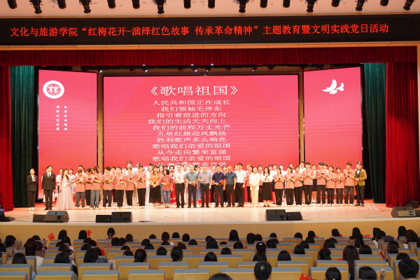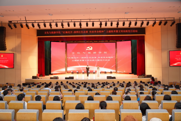 为深入学习贯彻习近平新时代中国特色社会主义思想主题教育,全面贯彻落实党的二十大精神,按照新时代党的建设总要求,紧扣立德树人根本任务,结合文化与旅游学院特色,充分发挥基层党组织政治功能和组织功能,开拓新时代党建育人新思路,6月13日,文化与旅游学院在学校综合楼开展““红梅花开—演绎红色故事 传承革命精神”主题教育暨文明实践党日活动。学校党委委员、副校长周毅,党委组织部部长付海涛,党委学工部部长、学生处处长程静,通识教育学院副院长罗纪红,文化与旅游学院党总支书记郑兵,副书记、院长柏文涌,副书记潘伟及学院师生代表600余人参加了本次活动。