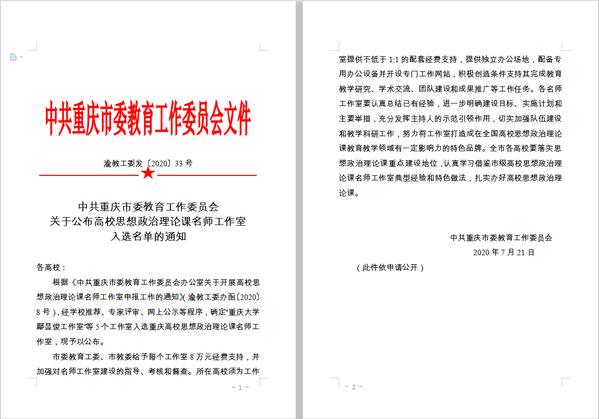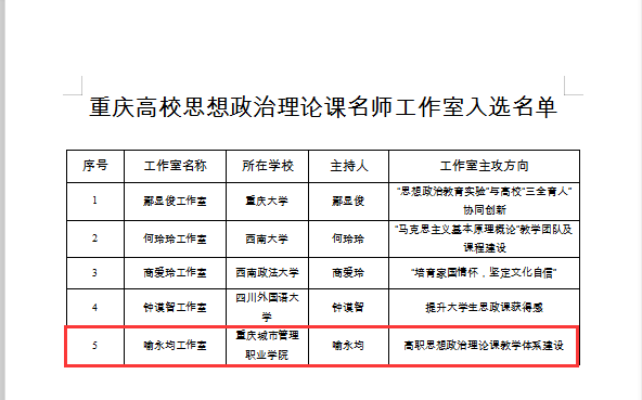 据悉,2017年中共重庆市委教育工委首次设立“ 理论课名师工作室”,本次是重庆市第二批 理论课名师工作室,这次入选的5个名师工作室分别来自重庆大学、西南大学、西南政法大学、四川外国语大学和重庆城市管理职业学院。