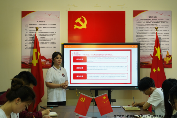 为深入贯彻习近平新时代中国特色社会主义思想和党的二十大精神,进一步提高党性修养,严明政治纪律和政治规矩,增强支部党员同志的纪律意识,不断增强党组织的纪律性,建筑与土木工程学院学生第二党支部于2024年4月28日中午在一教413开展《中国共产党纪律处分条例》专题学习,本次学习由支部副书记魏姗姗主讲。