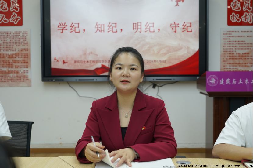 支部候补组织委员王彦杰说:“没有规矩不成方圆,希望大家一定要遵守纪律,不仅要从态度上去明确也要在行为上去完成,不忘初心,方得始终。”支部候补青年委员冉灵波说:“党纪既是悬在头上的一把利剑,也是握在手中的一把宝剑,希望大家要时刻警醒头上的‘利剑’,也要用好我们手中的‘宝剑’。”