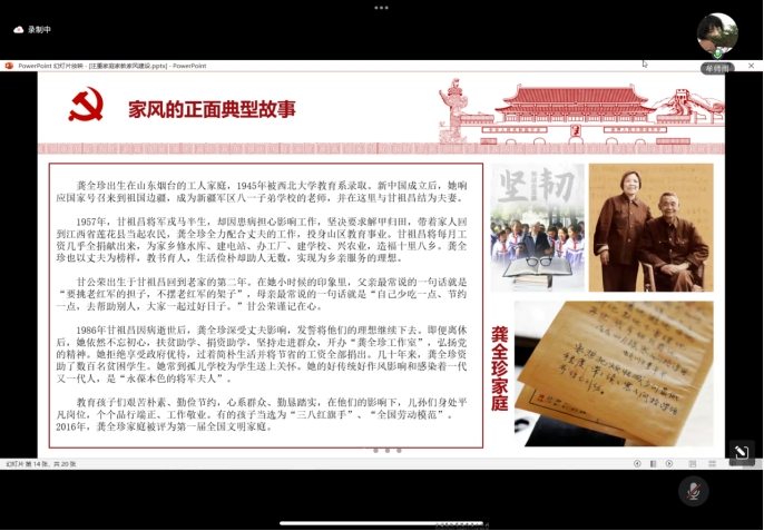 随后,牟师雨同志围绕家风的新时代内涵和要求展开阐述。家庭命运与国家命运紧密相连,家庭和睦幸福是国家稳定安康的基础,家风家训是家庭文化底蕴的彰显和社会精神文明建设的重要载体。习近平总书记指出要“推动形成爱国爱家、相亲相爱、向上向善、共建共享的社会主义家庭文明新风尚”,这指明了新时代家风家训的基本方向,是构建新时代家风家训的重要行动指南。
