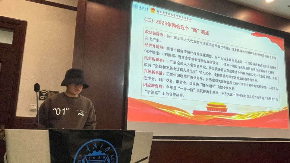 防灾研究生四党支部组织委员高丝雨分享学习感悟:今年是全面贯彻落实党的二十大精神的开局之年。全国两会胜利召开,把党的主张和人民意愿凝聚为国家意志,通过法定程序把党的二十大作出的决策部署转化为全国人民的实际行动,这对贯彻落实习近平新时代中国特色社会主义思想和党的二十大精神,动员全党全国各族人民为全面建设社会主义现代化国家、全面推进中华民族伟大复兴而团结奋斗,具有十分重要的意义。作为新时代的重庆大学研究生,我们要听党话、跟党走,积极投身于学习两会精神的热潮,努力学习学科理论知识,开展科学研究,以实际行动和专业技能造就人民群众,将个人发展紧紧融入党和国家发展的浪潮中,在奉献中实现自身价值!