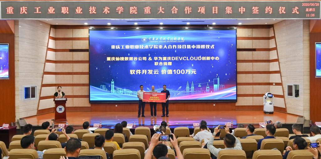 6月28日,重庆工业职业技术学院重大合作项目集中签约暨揭牌仪式在学校第一学术报告厅成功举行。市委教育工委委员、市教育委员会副主任邓沁泉,市经济和信息化委员会二级巡视员潘成彬,永川区委常委、区新城建管委党工委书记邓文,市高教学会执行会长、秘书长严欣平,市高教学会首席专家张宗荫,国家督学、市教育学会会长张荣,国家督学、市高职教育研究会会长张亚杭以及相关负责同志;重庆仙桃数据谷投资管理有限公司董事长汪小平等15家企业高级管理人员及代表;重庆工业职业技术学院院长郭天平,副院长徐益、徐兴旺、纪委书记谢涛、副院长赵柏森出席本次签约活动。学校各二级学院及职能部门负责人等参加活动。