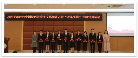 在宣讲中间环节,由党委宣传部部长李岚和党委组织部副部长黄旭为讲习社指导老师颁发聘书。据悉,指导老师主要由全国党建工作样板支部教工党员和学院长期从事党建工作的教师党员担任,他们始终秉持习近平新时代中国特色社会主义思想的核心内涵,对讲习社成员悉心指导,在新的一年开启讲习社全新的宣讲活动,将习近平新时代中国特色社会主义思想在学生群体中传播得更深更远。