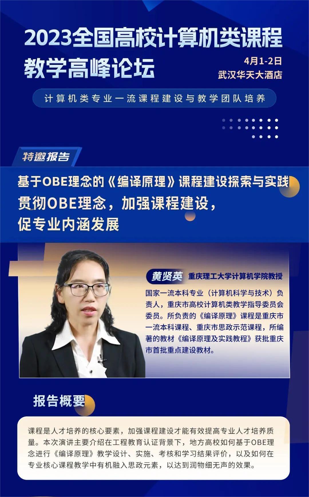 2023年4月2日,我校计算机科学与工程学院计科系教工党支部黄贤英教授受论坛邀请,在“2023全国高校计算机类课程教学高峰论坛——一流课程建设及教学团队的培养”作专题报告,报告题目为《基于OBE理念的“编译原理”课程建设探索与实践》。本次论坛由教育部高等学校计算机类专业教学指导委员会和全国高等学校计算机教育研究会主办,华中师范大学和清华大学出版社联合承办。