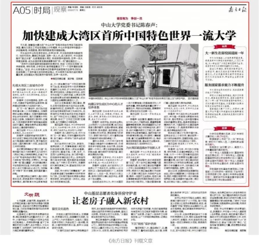 《南方日报》在2022年7月13日五版头条刊载了专访我校党委书记陈春声教授的报道,题为《加快建成大湾区首所中国特色世界一流大学》。