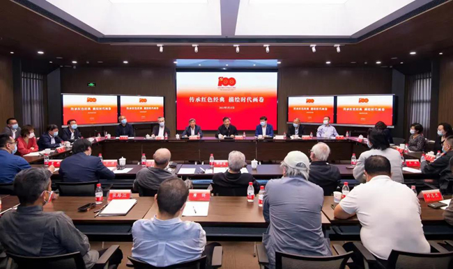 由中央广播电视总台和中央美术学院组织的《美术经典中的党史》交流座谈会5月10日在京举行。中宣部副部长、中央广播电视总台台长兼总编辑慎海雄出席并与中央美术学院师生进行交流。中央广播电视总台编务会议成员薛继军、王晓真,总台有关部门负责人一同参加。中央美术学院党委书记高洪,中央美术学院院长范迪安、副院长徐扬、吕品晶,著名美术家、老教授靳尚谊、文国璋、孙景波,各院系各部门负责人,参与建党100周年主题创作的教师代表等参加座谈会。