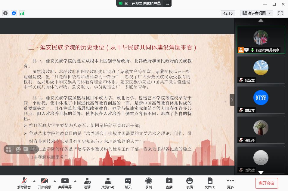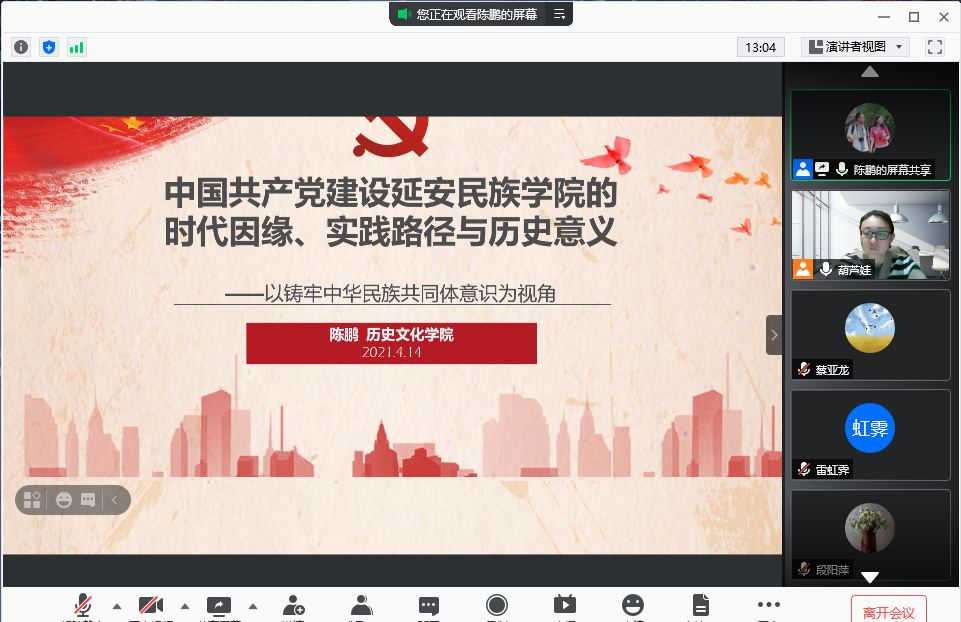 2021年4月14日晚,历史文化学院教工党支部党史学习教育专题微党课第二讲《中国共产党建设延安民族学院的时代因缘、实践路径与历史价值——以铸牢中华民族共同体意识为视角》顺利举办。本次微党课由副院长陈鹏副教授主讲,教工党支部书记胡晔老师主持,支部党员教师通过腾讯会议客户端线上聆听了讲演。
