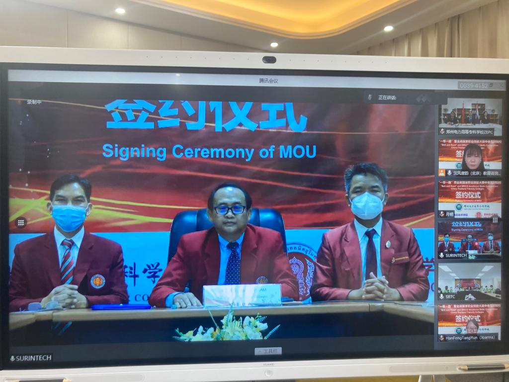 2021年9月8日,我校与泰国素叻他尼技术学院、泰国素林技术学院举行了国际合作线上签约仪式。校长杨建华和泰国素叻他尼技术学院校长施拉维、泰国素林技术学院校长维瓦特·班皮卡姆、副校长科瑞特善达特·瑞希痛、副校长派班·瑞克迪、副校长皮瑞·塞特·信侯塞、副校长苏维特·普瑞达空及我校相关部门负责人参加了签约仪式。