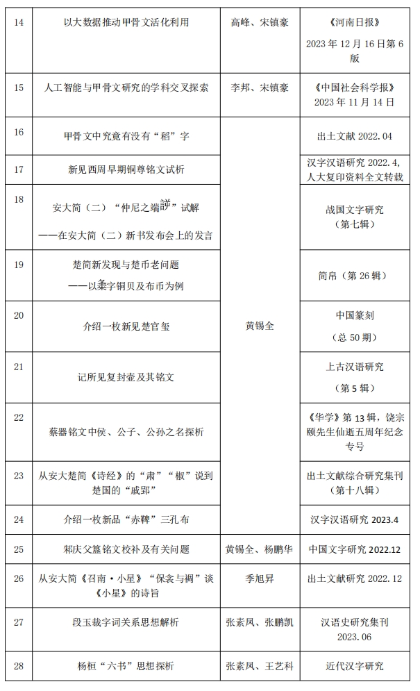 2022年12月至今,中心成员发表学术论文60篇,其中CSSCI期刊论文30余篇,分别发表在《中国语文》《古汉语研究》《光明日报》《浙江大学学报》《河南大学学报》《甲骨文与殷商史》《出土文献综合研究集刊》《简帛研究》《简帛》等刊物上,其中有4篇文章被人大复印资料《语言文字学》全文转载。
