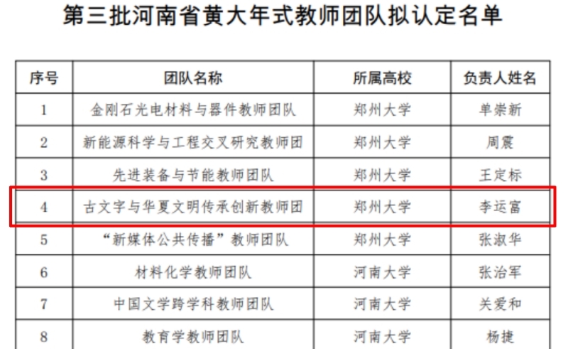 2023年6月27日,河南省教育厅公布了第三批河南省本科高校黄大年式教师团队评选结果,郑州大学汉字文明研究中心申报的“古文字与华夏文明传承创新教师团队”成功入选。