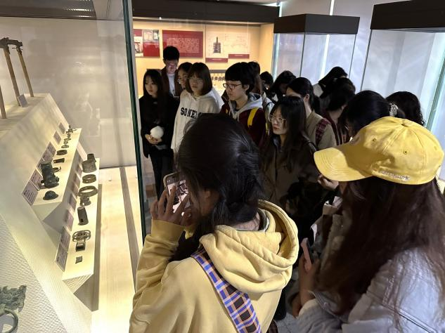 11月16日上午,师生们首先参观了郑国车马坑遗址博物馆。讲解员从郑国建立、迁移与发展壮大的历史讲起,围绕出土的器物介绍了春秋战国时期的礼乐文化与制度,重点讲解了著名的“中”字型三号坑大墓以及最先挖掘的一号墓。实景观看和体验使《左传》中白纸黑字的历史具象化地呈现出来,加深了同学们对春秋战国时期郑国社会面貌及礼仪制度的直观认识。