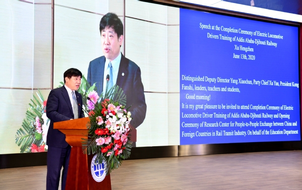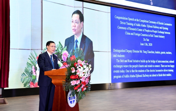 校党委书记许琰代表学校对与会领导嘉宾表示热烈欢迎和衷心感谢。他在致辞中表示,一带一路,架起互联互通桥梁;人文交流,编织民心相通纽带。2019年10月,学校举办了亚吉铁路电力机车司机培训开班典礼暨人文交流论坛,历时八个月,34名留学生即将学成归国。他寄语全体学员,学成归国后要勇挑重担,磨练意志,并日益精进;成为中非人文交流的使者,成为“一带一路”倡议在非洲的推动者;最后祝福学员们在亚吉铁路线上大展身手,在“一带一路”舞台上勇创佳绩。许琰指出,此次培训是中外人文交流的范例,学校正是深耕轨道交通行业优势、积极参与“一带一路”建设,才获得了教育部中外人文交流中心的青睐和信任。学校将以建设轨道交通行业中外人文交流研究院为契机,依托教育部中外人文交流中心在政策、智力、人才等方面优势,秉承学校轨道交通专业“引进来、走出去、创标杆”的工作思路,打造国际教育合作“卓越工程”,贡献国际职业教育“中国方案”,构建国际交通教育“利益共同体”,充分发挥人文交流在职业教育改革和“双高”建设中的重要作用,着力打造中国特色轨道交通行业人文交流研究的交流平台和重要智库。