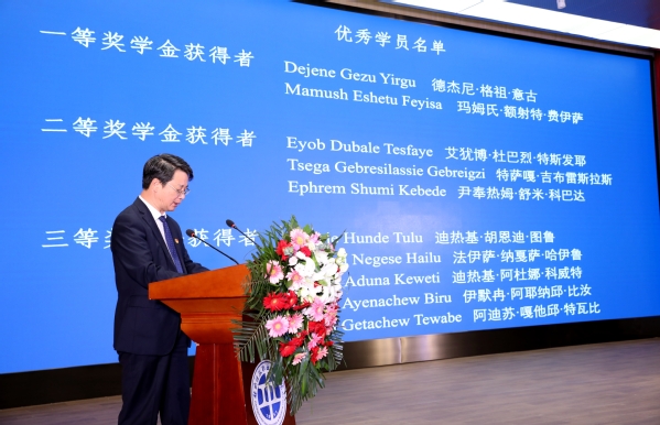 副校长倪居宣读了优秀学员名单。河南省教育厅对外合作与交流处处长徐恒振,党委副书记、校长孔凡士共同为优秀学员颁发证书和奖学金牌匾。中国铁路郑州局集团有限公司职工培训部副部长杨明卿,副校长董黎生为全体学员颁发了结业证书和亚吉铁路电力机车司机(中国)培训合格证书。