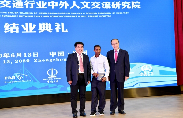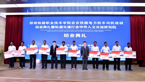中国铁路郑州局集团有限公司职工培训部副部长杨明卿、副校长董黎生共同为学员颁发结业证书和亚吉铁路电力机车司机(中国)培训合格证书