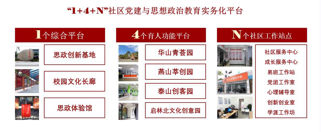 学校集课内课外、线下线上、校内校外育人资源,在学生社区搭建了“1+4+N”学生社区党建与思想政治教育实务化平台。