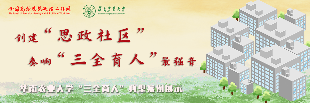 华南农业大学从2011年开始,推动学生思想政治工作进社区,以“贴近实际、贴近生活、贴近学生”的原则,坚持因事而化、因时而进、因势而新,把学生社区作为思政工作的重要阵地,以建立育人工作机制为根本,以丰富育人资源为基础,以拓展育人平台为抓手,将学生社区打造成“思政社区”,促使学生社区成为基层党建新堡垒、思政教育新课堂、实践服务新基地。